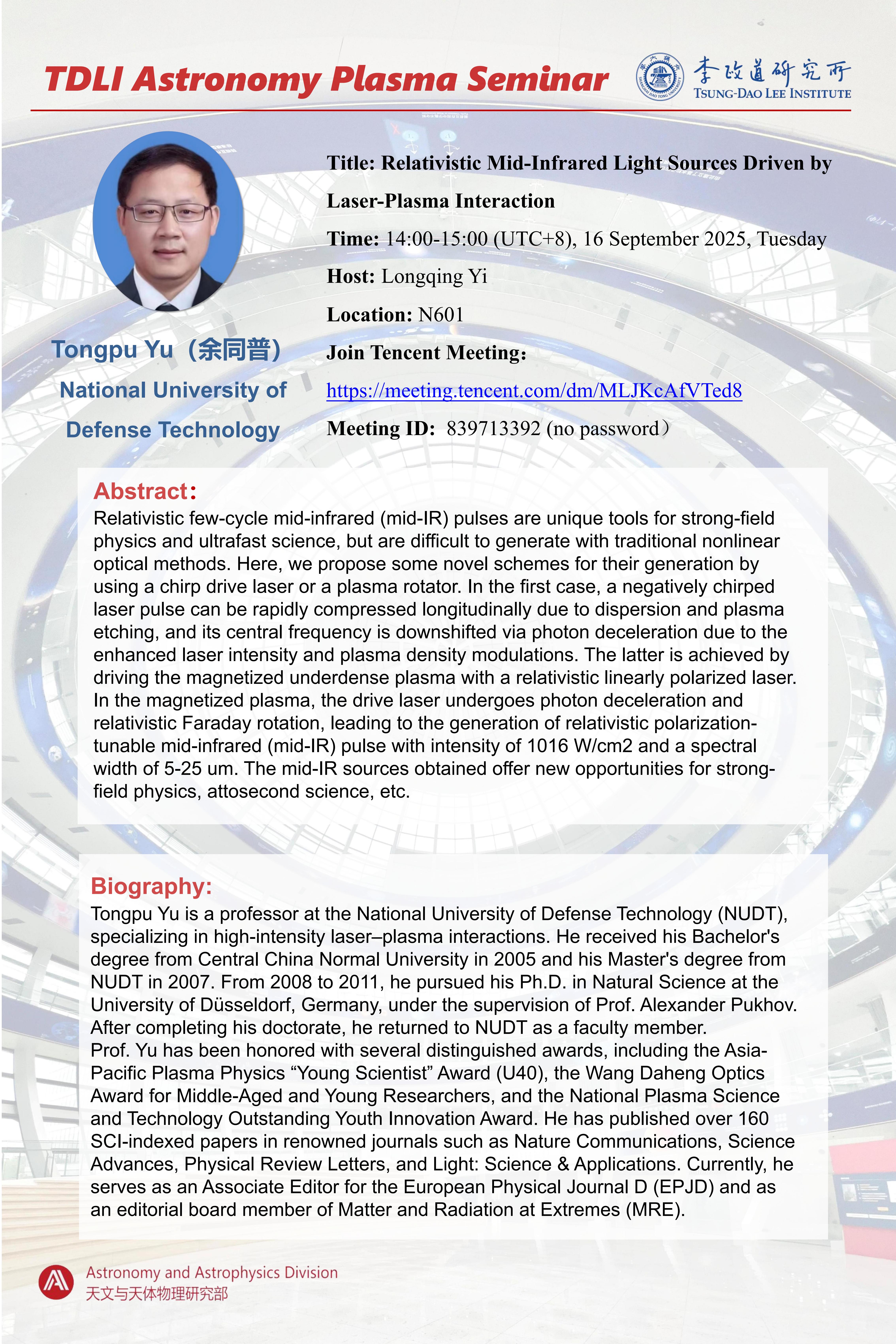 Prof. Yu has been honored with several distinguished awards, including the Asia-Pacific Plasma Physics “Young Scientist” Award (U40), the Wang Daheng Optics Award for Middle-Aged and Young Researchers, and the National Plasma Science and Technology Outstanding Youth Innovation Award. He has published over 160 SCI-indexed papers in renowned journals such as Nature Communications, Science Advances, Physical Review Letters, and Light: Science & Applications. Currently, he serves as an Associate Editor for the European Physical Journal D (EPJD) and as an editorial board member of Matter and Radiation at Extremes (MRE).