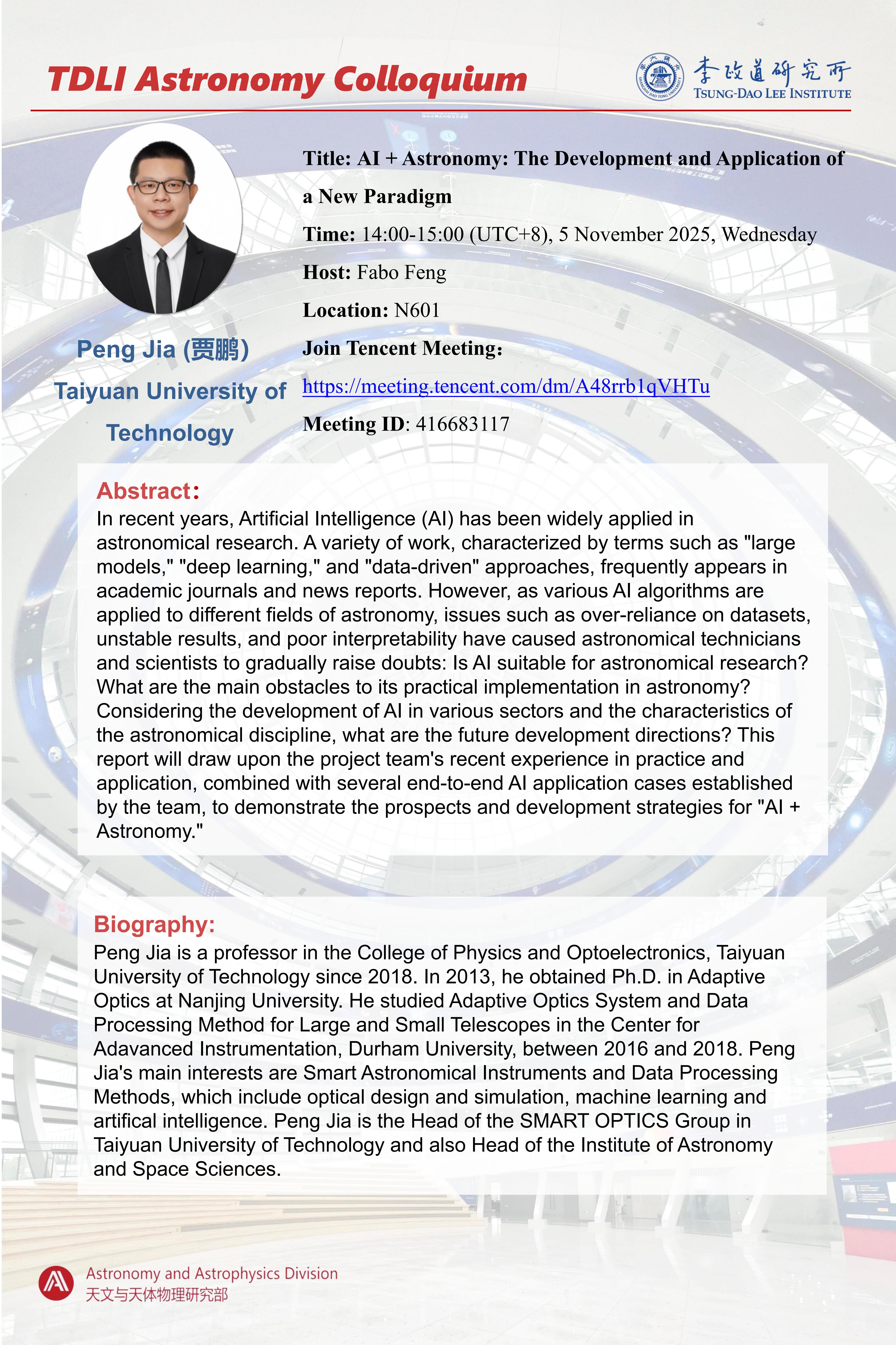 Peng Jia is a professor in the College of Physics and Optoelectronics, Taiyuan University of Technology since 2018. In 2013, he obtained Ph.D. in Adaptive Optics at Nanjing University. He studied Adaptive Optics System and Data Processing Method for Large and Small Telescopes in the Center for Adavanced Instrumentation, Durham University, between 2016 and 2018. Peng Jia's main interests are Smart Astronomical Instruments and Data Processing Methods, which include optical design and simulation, machine learning and artifical intelligence. Peng Jia is the Head of the SMART OPTICS Group in Taiyuan University of Technology and also Head of the Institute of Astronomy and Space Sciences.